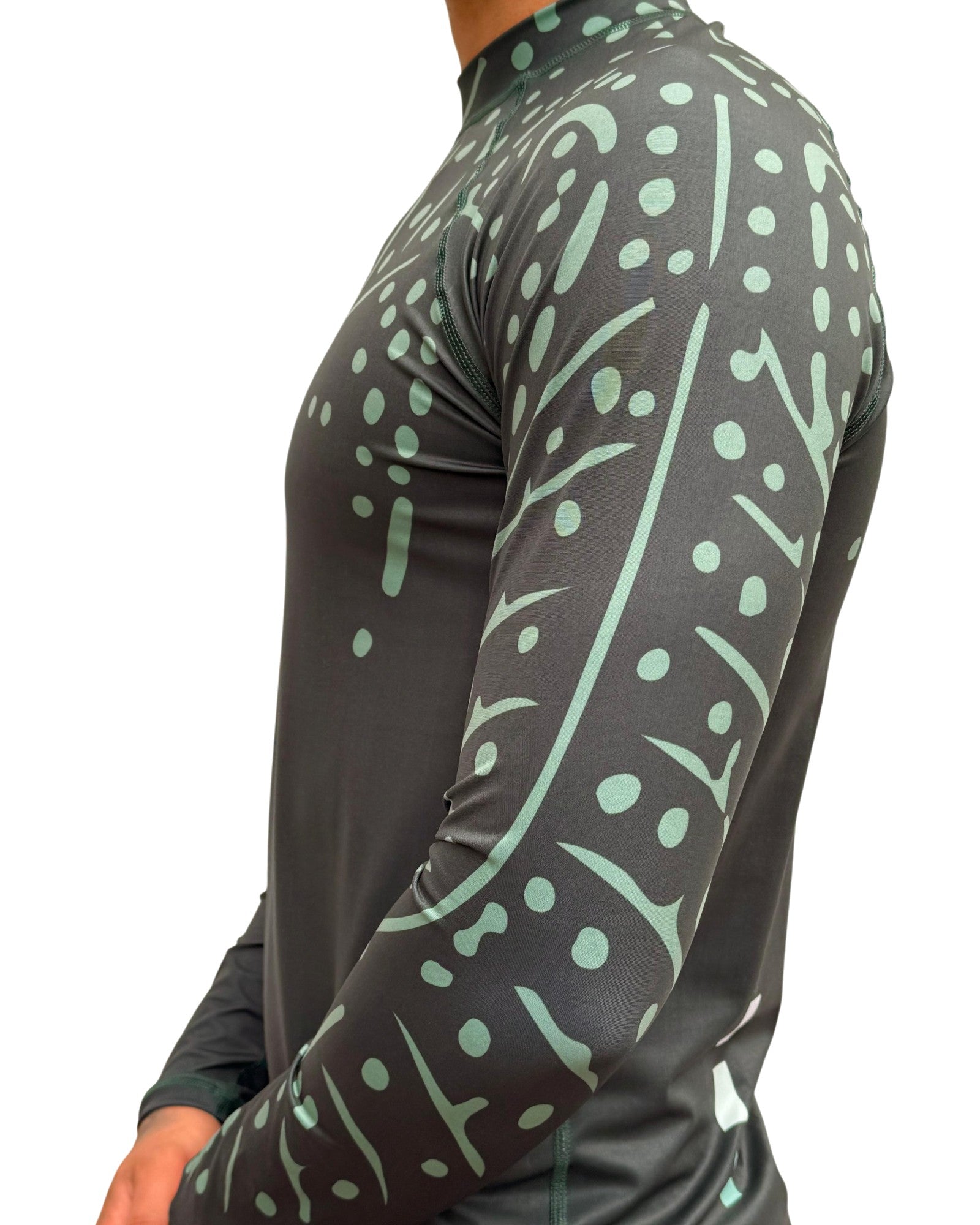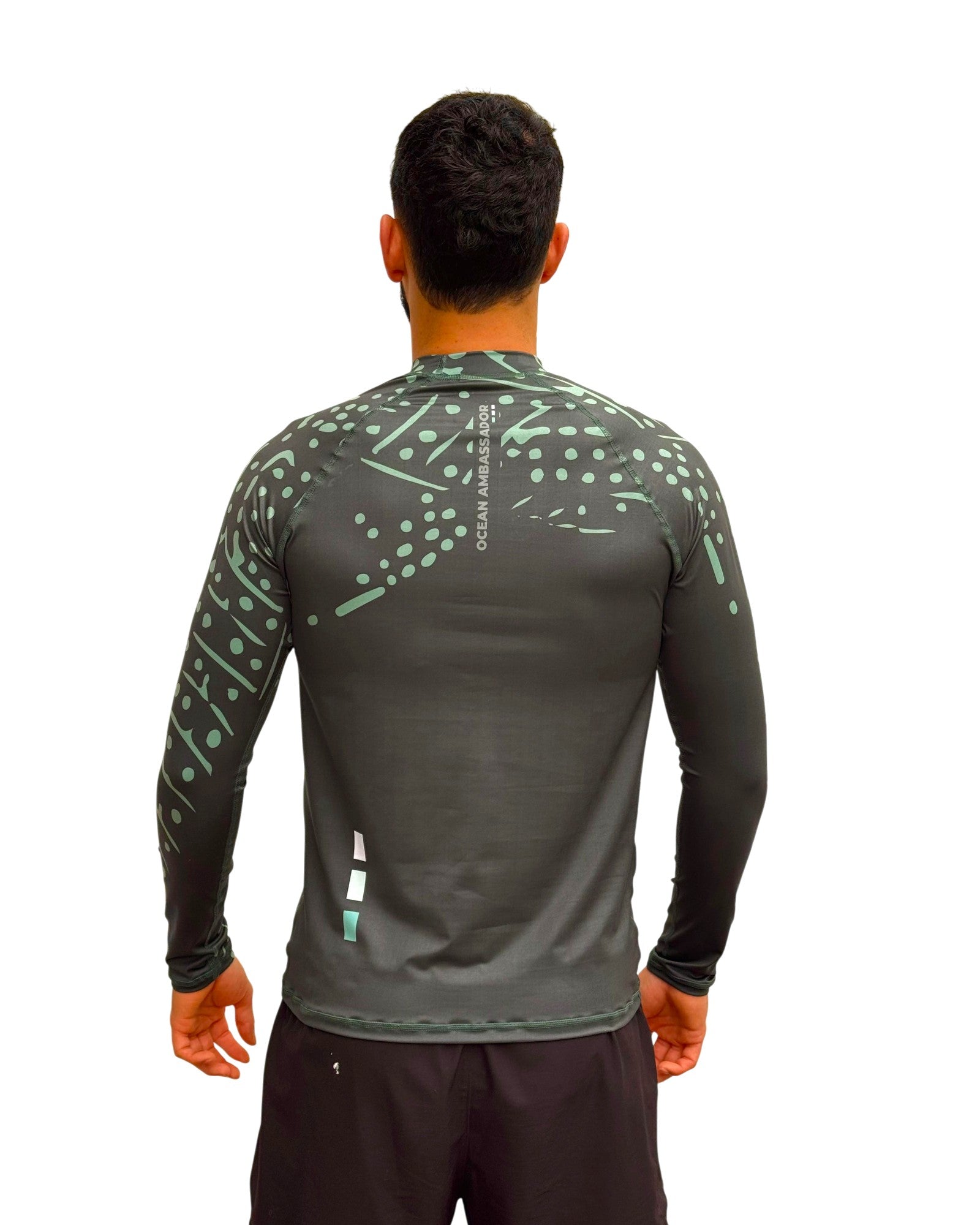 El Rashguard Hombre Ocean Ambassador es la prenda ideal para quienes viven conectados con el mar. Su diseño en verde militar está inspirado en el tiburón ballena, el nómada más grande del océano, y combina performance, estilo y conciencia ambiental.